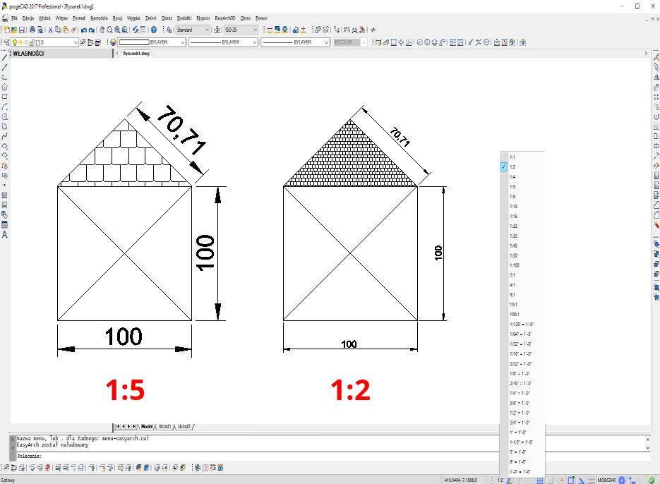 progeCAD pozwala przypisać notatki skalę własności (anotativní skalę, opisowy skalę) obiekty, których wielkość na papierze nie jest zależny od skali rysunku. Są to następujące objekty: