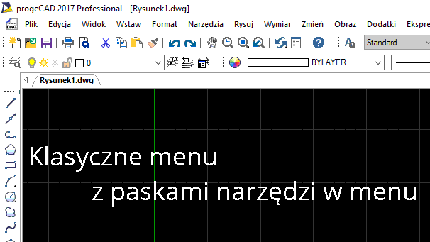 - menu wstążkowe lub klasyczne menu - progeCAD 2021 obsługuje dwa różne interfejsy użytkownika,