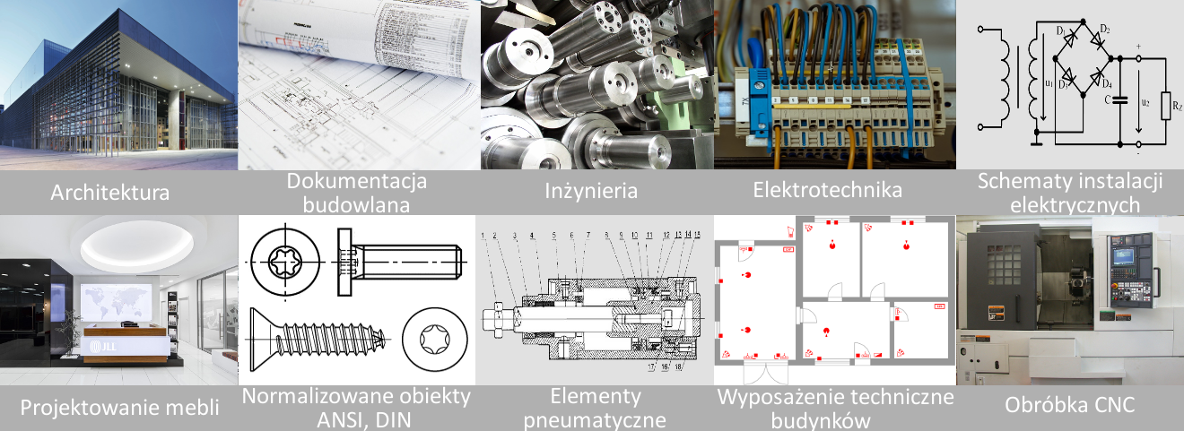 Architektura; Dokumenty budowlane; inżynieria mechaniczna; Elektrotechnika; Schematy elektryczne; Produkcja mebli; Standardowe elementy ANSI, DIN; Komponenty pneumatyczne; HVAC; Produkcji CNC.
